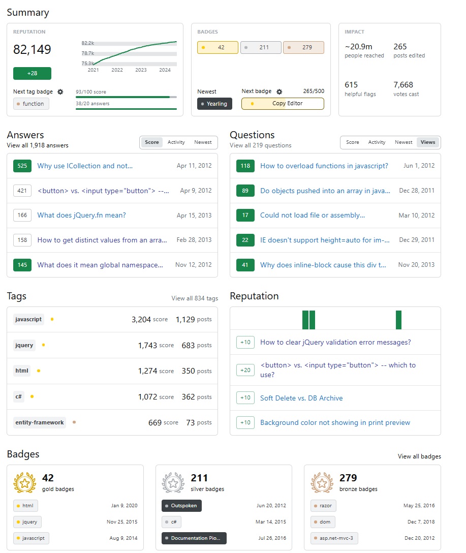 As one of Stack Overflow’s most impactful contributors, I rank among the top 1,000 users out of a global community of 25 million developers. My contributions have reached over 20 million developers, making me a trusted resource for technical problem-solving and guidance within the developer ecosystem.